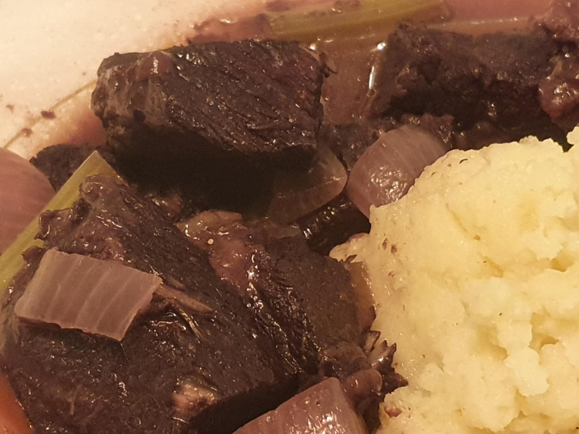 6. Häll över till individuella tallrikar när kokvätskan har reducerats och köttet är mycket mjuk, häll över på individuella tallrikar. Servera med polenta eller potatismos.
