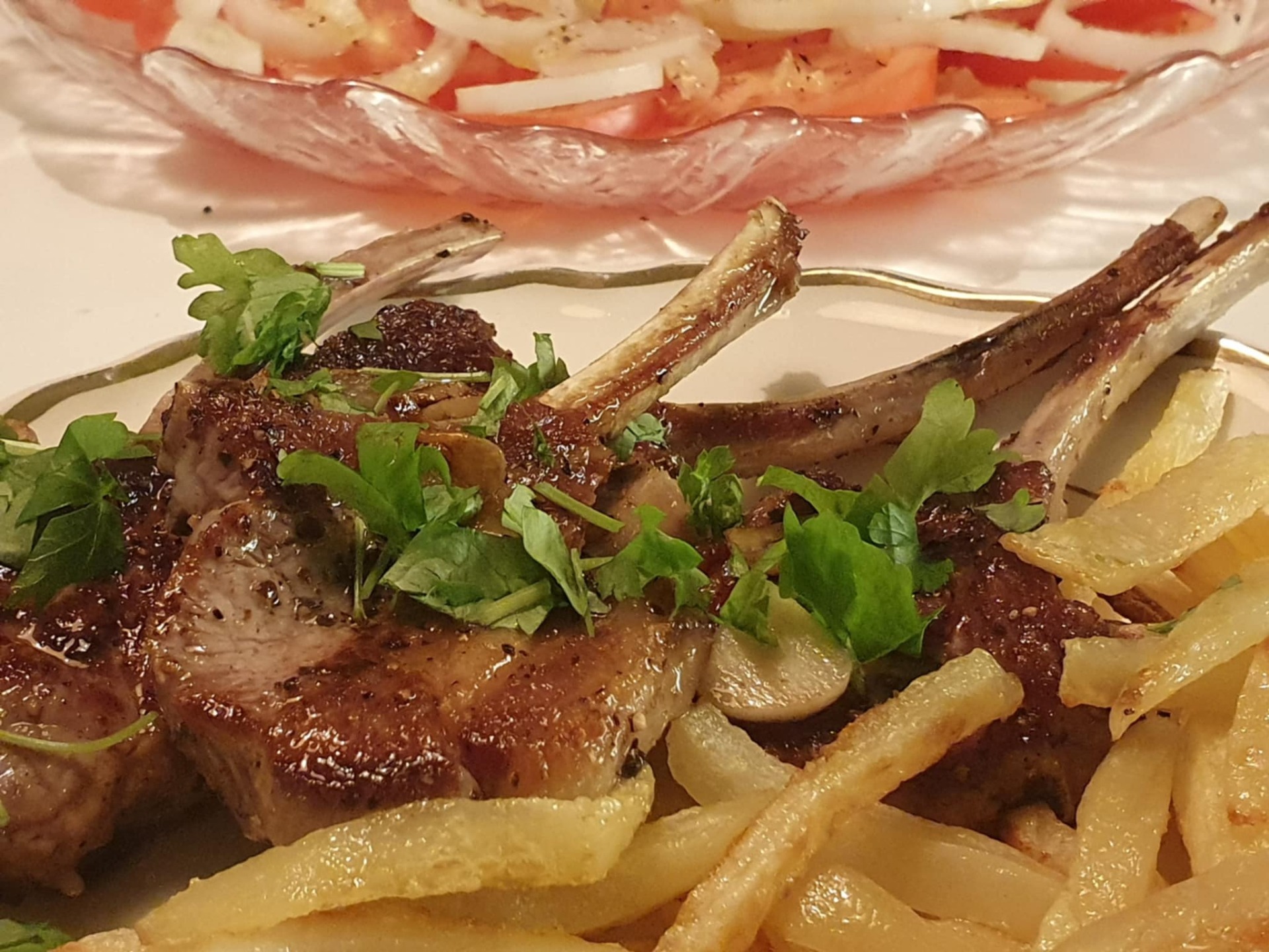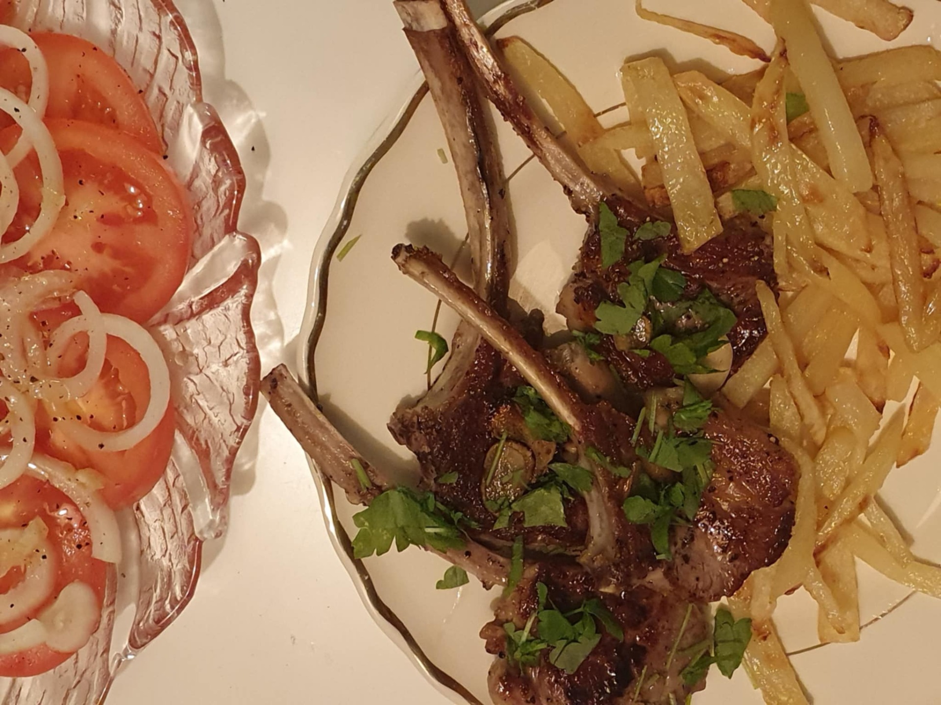 Att grilla lammkotletter kräver inga större matlagningskunskaper, se bara till att grillen är rykande het, penslad med olivolja, att kotletterna kryddas med salt och peppar och att de grillas tills de är väl brynta på båda sidor. Håll ett öga på grillen så kotletterna inte blir överstekta och torra bara. Med massor av pommes frites, så det finns ingen anledning att krångla till det. Eller det är klart, en god tomat- och löksallad passar fint till (recept på både ugnsbakade pommes frites och tomat- och löksallad finns på hemsidan).