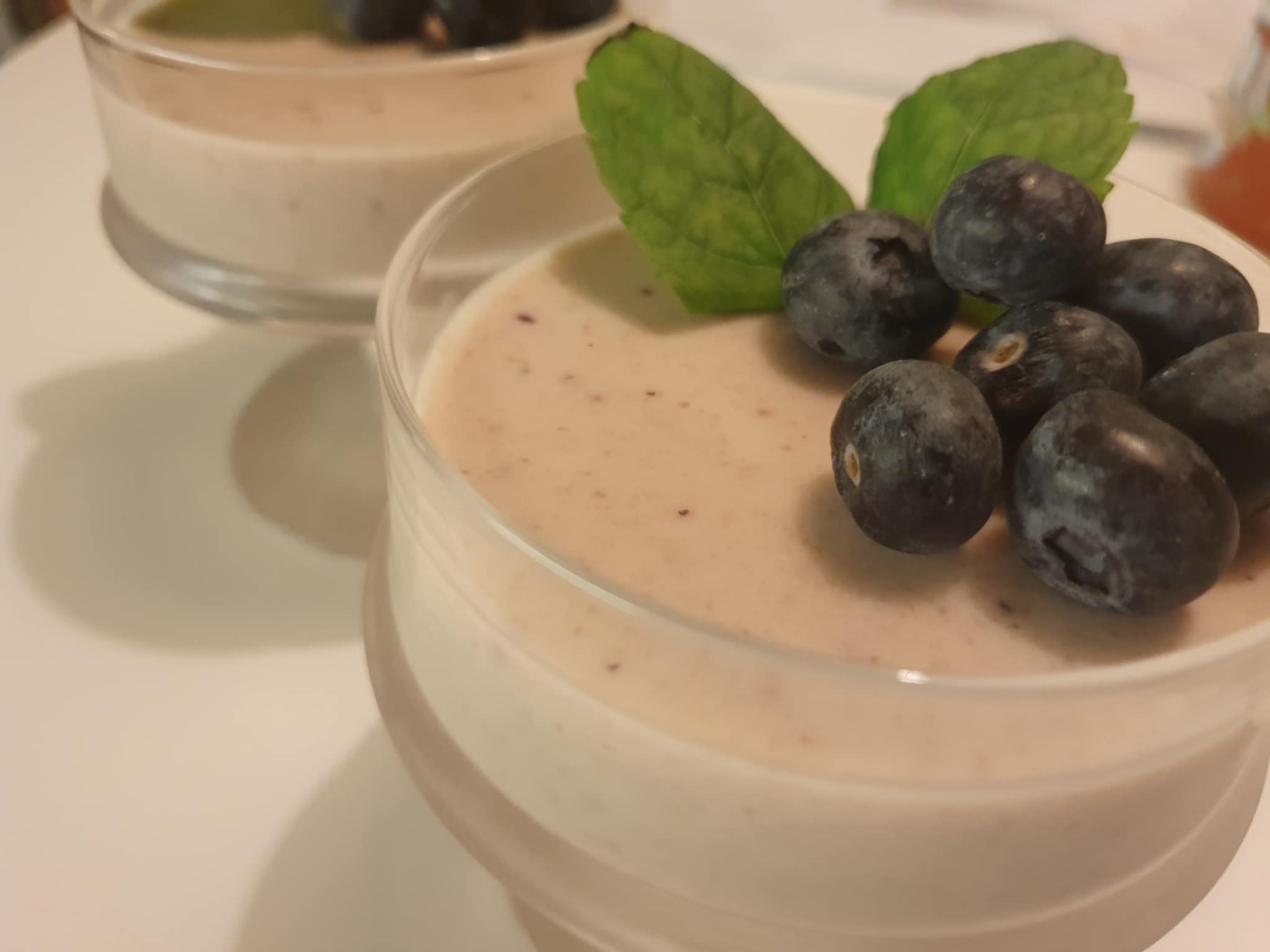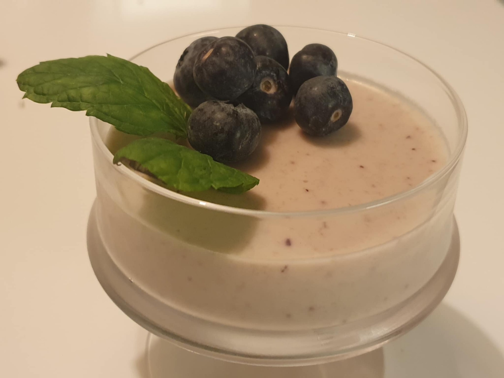 Blåbärspannacotta är en uppfriskande dessert som är otroligt enkel att göra. Panacotta görs vanligtvis enkel och dekoreras sedan med olika frukt- eller chokladsmaker. Här är den smaksatt med blåbärspuré vilket också ger färg. Pannacotta (panna cotta = kokt grädde) är en norditaliensk dessert, som en pudding fast med gelatin istället för ägg.